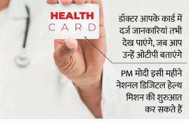 प्रधानमंत्री नरेंद्र मोदी इसी महीने नेशनल डिजिटल हेल्थ मिशन (एनडीएचएम) लॉन्च कर सकते हैं। नेशनल डिजिटल हेल्थ मिशन में डॉक्टर्स, अस्पताल, लैब और केमिस्ट तक की जानकारी दर्ज होंगी। इसका पायलट प्रोजेक्ट पिछले साल ही अंडमान-निकोबार, चंडीगढ़, दादर नागर हवेली, दमनदीव, लद्दाख और लक्षद्वीप में शुरू हुआ था। इन राज्यों में यूनिक कार्ड बनने शुरू हो चुकी हैं। अब यह योजना देशभर में लॉन्च की जाएगी।