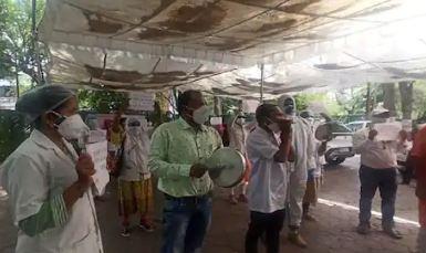 मध्यप्रदेश में संविदा स्वास्थ्य कर्मचारियों ने अनिश्चितकालीन हड़ताल के दूसरे दिन मंगलवार को ज़िला मुख्यालय पर थाली और शंख बजाकर प्रदर्शन किया. इस प्रदर्शन के दौरान सोशल डिस्टेंस और कोरोना गाइडलाइन का पालन किया गया. कर्मचारी पीपी किट में भी नजर आए. भोपाल के जेपी अस्पताल में प्रदर्शन के दौरान थाली और शंख बजाकर अपनी मांगों की तरफ शासन प्रशासन का ध्यान खींचने की कोशिश की गई.
