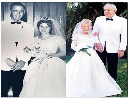 अमेरिका के कैरेन और गैरी रेयान ने अपनी शादी की 59वीं सालगिरह पर जिंदगी के इस खास दिन से जुड़ी यादों को फिर से ताजा किया। दोनों ने वेडिंग ड्रेस पहनकर एक बार फिर से वैसा ही फोटोशूट करवाया जैसा 59 साल पहले शादी पर करवाया था। दोनों की उम्र 79 साल है और पिछले साल कोरोना के चलते वे अच्छे तरीके से वेडिंग एनिवर्सरी सेलिब्रेट नहीं कर पाए थे। ऐसे में इस बार उनकी पोती निकी ने सोचा कि सेलिब्रेशन होगा लेकिन इस अंदाज में होगा, इसका कोई प्लान नहीं था।
