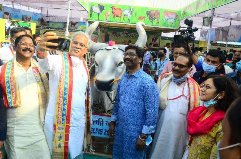 रायपुर : राजधानी रायपुर के साईंस कॉलेज मैदान में आयोजित राष्ट्रीय आदिवासी नृत्य महोत्सव में हर तरफ उत्साह का माहौल बना हुआ है। आज शुभारंभ अवसर पर मुख्यमंत्री श्री भूपेश बघेल ने समारोह के मुख्य अतिथि झारखंड के मुख्यमंत्री श्री हेमंत सोरेन के साथ सेल्फ जोन में पहुंचकर सेल्फी लिया। समारोह स्थल पर आदिवासी संस्कृतियों तथा छत्तीसगढ़ के ग्रामीण परिवेश की झलकियों को समेटे आकर्षक सेल्फी जोन भी बनाए गए हैं। इस अवसर पर संस्कृति मंत्री श्री अमरजीत भगत, आदिम जाति विकास मंत्री डॉ. प्रेमसाय सिंह टेकाम सहित अन्य जनप्रतिनिधि उपस्थित थे।