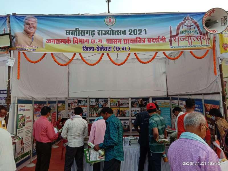 बेमेतरा : छत्तीसगढ़ राज्य के 21वें स्थापना दिवस के अवसर पर आयोजित जिला स्तरीय एक दिवसीय कार्यक्रम राज्योज्सव 2021 का आयोजन जिले के एतिहासिक बेसिक स्कूल मैदान मे किया गया। जिसका शुभारंभ प्रदेश के संसदीय सचिव श्री विकास उपध्याय ने किया। इस अवसर पर विधायक बेमेतरा श्री आशीष छाबड़ा, जिला पंचायत सदस्य श्रीमती शशिप्रभा गायकवाड़ सहित अन्य जनप्रतिनिधि उपस्थित थे। बेसिक स्कूल मैदान में आयोजित राज्योत्सव समारोह पर जनसंपर्क विभाग द्वारा कलेक्टर श्री विलास भोसकर संदीपान के मार्गदर्शन में आयोजित विकास छायाचित्र प्रदर्शनी को आम जनता का अच्छा प्रतिसाद मिला। विभिन्न विभागों द्वारा लगाये गये प्रदर्शनियों को देखने दर्शक बड़ी संख्या में उपस्थित हुए। प्रदर्शनी में मुख्यमंत्री श्री भूपेश बघेल के बेमेतरा जिले में आयोजित कार्यक्रमों, उनके द्वारा जिले को दी गई सौगातें, फ्लैगशिप योजनाओं, नरवा, गरवा घुरवा अऊ बाड़ी, गौठान, राजीव गांधी किसान न्याय योजना, मुख्यमंत्री हाट-बाजार क्लिनिक योजना, विकास कार्यों, मुख्यमंत्री खाद्यान्न सहायता योजना, नरवा विकास योजना, गोठानों की आर्थिक गतिविधियों, एपीएल परिवारों को राशन कार्ड, राशन वितरण, धन्वंतरी जेनेरिक मेडिकल स्टोर, जिला प्रशासन द्वारा जनहित में किए जा रहे कार्यों आदि योजनाओं, कार्यक्रमों पर आधारित आकर्षक फोटो प्रदर्शनी लगाई गई थी। जनसंपर्क विभाग द्वारा किया जा रहा प्रचार सामग्रियों का वितरण-जनसंपर्क के फोटो प्रदर्शनी स्टाल में विभाग द्वारा प्रकाशित प्रचार साहित्य सामग्रियों का वितरण किया गया। इस अवसर पर जनमन मासिक पत्रिका का वितरण, कोरोना गाईड, मुख्यमंत्री वृक्षारोपण प्रोत्साहन योजना मार्गदर्शिका, राजीव गांधी ग्रामीण भूमिहीन कृषि मजदूर न्याय योजना मार्गदर्शिका एवं सरकारी योजनाओं पर आधारित ब्रोसर का विभाग के कर्मचारियों द्वारा राज्योत्सव में पहुंचे आम जनता, प्रतियोगी परीक्षाओं की तैयारी में जुटे विद्यार्थियों और नागरिकों को प्रचार सामग्रियों का वितरण किया गया।