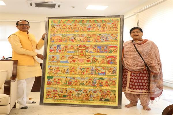 भोपाल : मुख्यमंत्री श्री शिवराज सिंह चौहान को आज संस्कृति मंत्री सुश्री उषा ठाकुर ने मधुबनी चित्रकला का एक अद्भुत नमूना भेंट किया। इस विशाल चित्र में चित्रकार श्री देवेश ठाकुर ने संपूर्ण हनुमान चालीसा चित्रित की है।