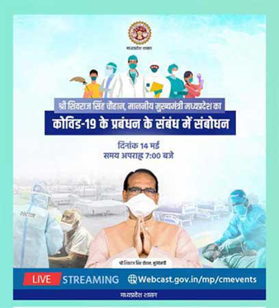 भोपाल : मुख्यमंत्री श्री शिवराज सिंह चौहान कोविड-19 के प्रबंधन के संबंध में प्रदेश की जनता को संबोधित करेंगे। यह संबोधन शुक्रवार 14 मई, 2021 को शाम 7 बजे सभी रीजनल चैनल्स के माध्यम से प्रसारित किया जायेगा। इसी के साथ आधिकारिक सोशल मीडिया प्लेटफॉर्म पर भी इसका प्रसारण होगा। एनआईसी के वेबकॉस्ट लिंक https://webcast.gov.in/mp/cmeventsके माध्यम से लाखों लोग जुड़ेंगे।